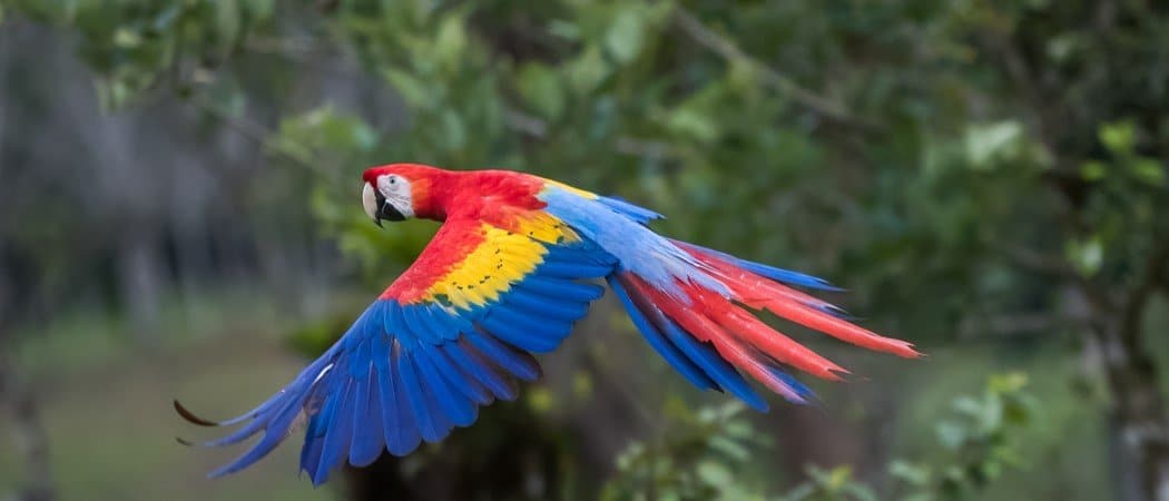 Native to Central and South America, the scarlet macaw is a stunning bird and a popular pet. They prefer humid evergreen forests and are the national bird of Honduras. Scarlet macaws are large parrots with red, yellow, and blue plumage. They are around 32 inches long but more than half of their length is made up of their long tail. Scarlet macaws use incredibly loud squawks and screeches to communicate. These calls are intended to carry over a distance of several miles to their groups. Scarlet macaws mate for life and can be extremely aggressive during the breeding season.
