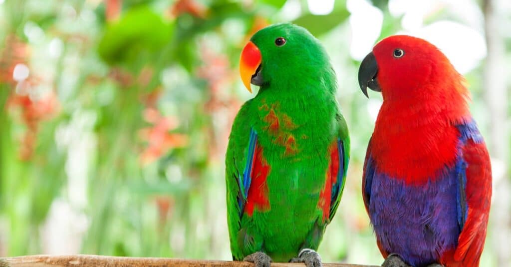 The grand eclectus is native to Australia, the Solomon Islands, Sumba, New Guinea, and the Maluku Islands where they favor tropical rainforests. They are particularly unusual as the male and female are completely different colors, and for a long time it was thought that they were two different species. Males are bright green with red under their wings and on the sides of their bodies, while females are mostly a rich red with purple across their back, abdomen, and underside of their wings. Grand eclectus parrots make their nests in hollows in large trees. Females remain in the nest for around 11 months of the year and fiercely defend it against other parrots, although they rarely leave the nest and rely on the male to bring them food.